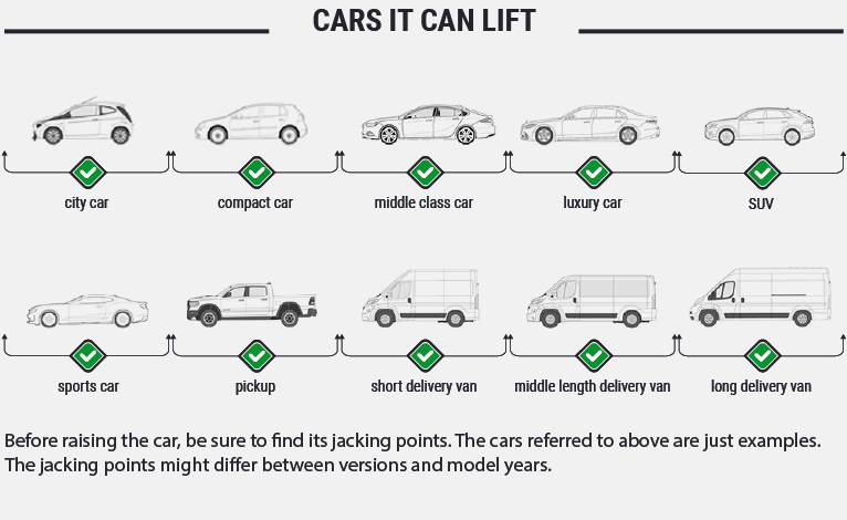 • Bras de levage télescopiques (3 extensions de 786 mm à 1798 mm), facilitant l’entretien et les réparations même des grands utilitaires