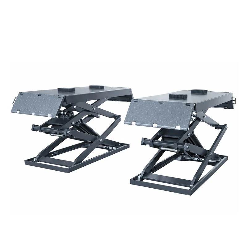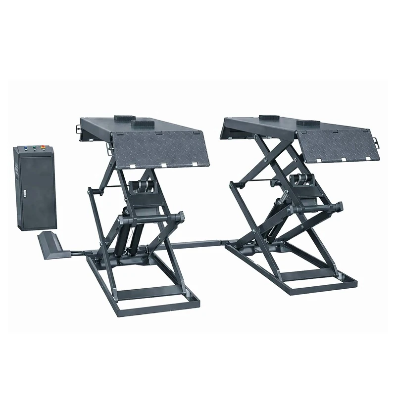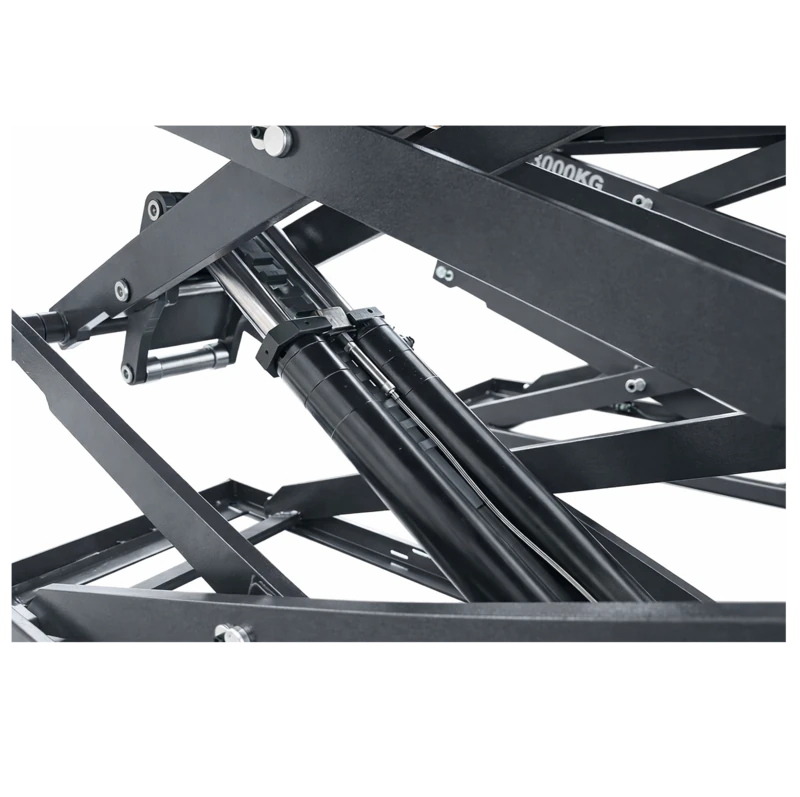 Le pont double ciseaux à poser possède un châssis à ciseaux fin ce qui lui permet d’avoir un encombrement réduit et d’autant plus qu’il ne nécessite d’aucun fossé. Sa faible hauteur de 110mm permet le levage de véhicule à faible garde au sol.